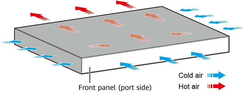 The switch has three built-in fans for forced air cooling. Air flows in from the left, right, and front sides, and exhausts from the rear panel.